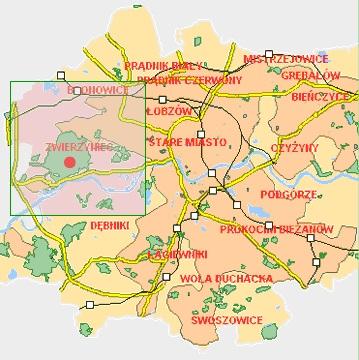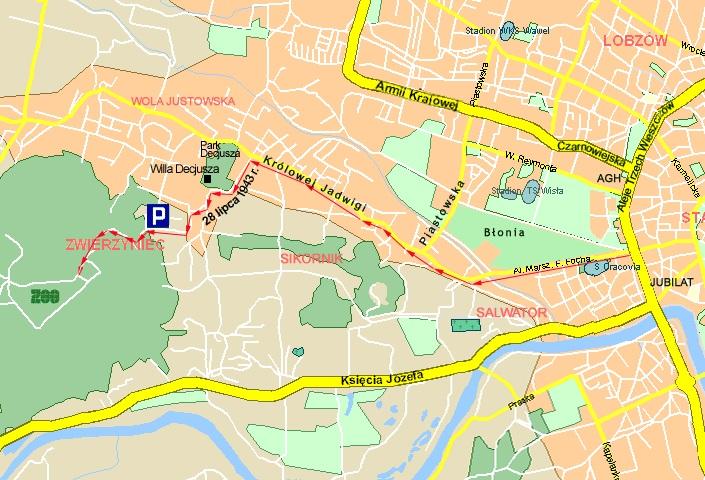 - 2-es parkoló - Az ulica Kukułcza (a második térképen "P" betűvel jelezve) parkolója 480 férőhelyet kínál. Az állatkert innen kb 1 km séta az erdőben, főút mentén, de a fent említett 134-es busszal is tovább lehet menni (egy megállót) az állatkerthez. A parkoló a hét minden napján rendelkezésetekre áll. Személyautóknak a díj 15 pln öt órára. Minden további megkezdett óra 3 pln-be kerül.